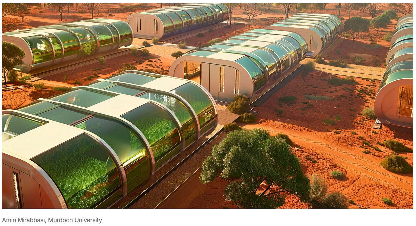 A student at Murdock University’s newly opened Algae Innovation Hub has designed micro-algae filled photobioreactors which can be incorporated into houses, apartments, mining dongas (huts where miners sleep) and other urban designs. These micro-algae designs can remove carbon from the environment at 10 to 50 times the rate of plants and trees. They also provide heat absorption which is important in many hot and dry locations in Western Australia.